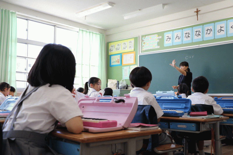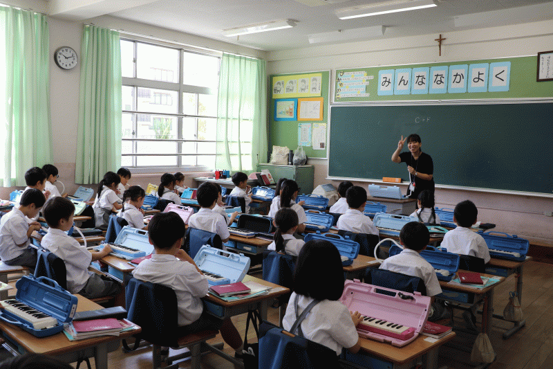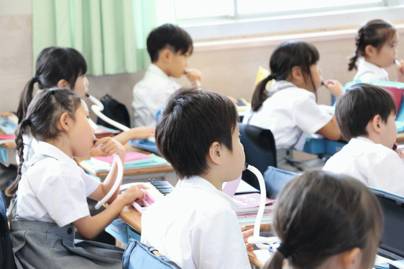 一年生の音楽の授業を覗いてみると、9月になってから始まった鍵盤ハーモニカの授業が行われていました。
