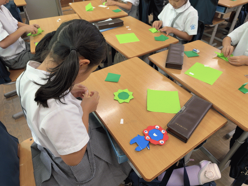 二年生の特別活動では、グリーンカラーのミャクミャクをみんなで作成中!クラスによって、様々な色分けをしていて、個性たっぷりです。