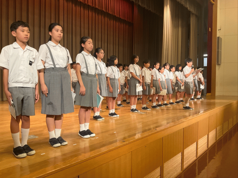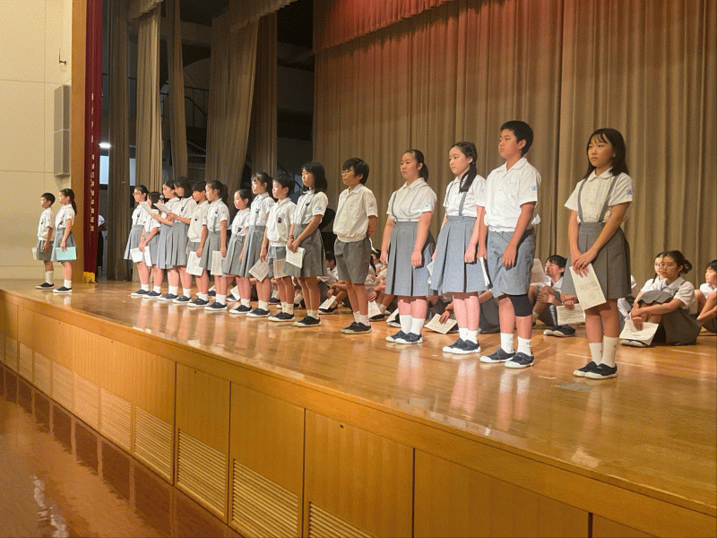 大阪信愛学院高校から、高校生のお兄さんとお姉さんが来校し、児童朝会で説明をしてくれました。