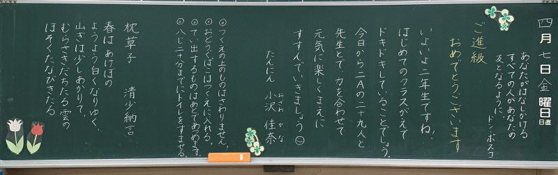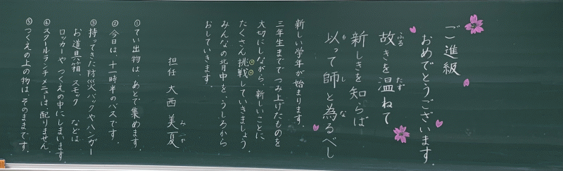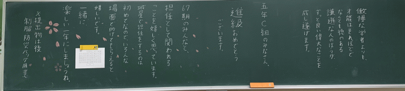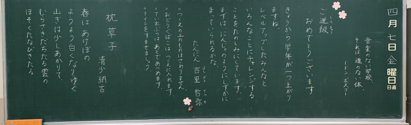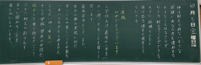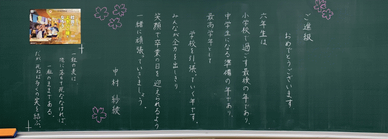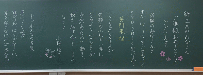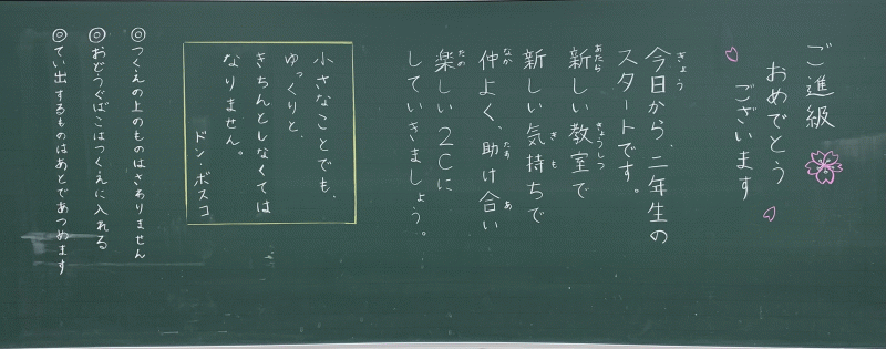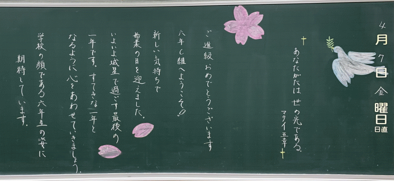 全 2994 件(全599ページ) 過去のページもご覧いただけます ⇒ 前へ 121 | 122 | 123 | 124 | 125 | 次へ 2023/4/7 各クラスの黒板(5・6年生) 5A 5A 5B 5B 5C 5C 6A 6A 6B 6B 6C 6C 各クラスの黒板(5・6年生) 2023/4/7 5A 5A 5B 5B 5C 5C 6A 6A 6B 6B 6C 6C 2023/4/7 各クラスの黒板(3・4年生) 3A 3A 3B 3B 3C 3C 3D 3D 4A 4A 4B 4B 4C 4C 各クラスの黒板(3・4年生) 2023/4/7 3A 3A 3B 3B 3C 3C 3D 3D 4A 4A 4B 4B 4C 4C 2023/4/7 各クラスの黒板(2年生) 2A 2A 2B 2B 2C 2C 2D 2D 各クラスの黒板(2年生) 2023/4/7 2A 2A 2B 2B 2C 2C 2D 2D 2023/4/7 新しく着任された先生方 Part1 この春、新しく城星学園小学校にお迎えした先生方をご紹介します。共に学び共に遊ぶ、授業と休み時間が今から楽しみですね。 水上采香先生(音楽) 水上采香先生(音楽) Garrett Boyd先生(英語) 北村未来先生(2年生担任) Garrett Boyd先生(英語) 北村未来先生(2年生担任) 新しく着任された先生方 Part1 2023/4/7 この春、新しく城星学園小学校にお迎えした先生方をご紹介します。共に学び共に遊ぶ、授業と休み時間が今から楽しみですね。 水上采香先生(音楽) 水上采香先生(音楽) Garrett Boyd先生(英語) 北村未来先生(2年生担任) Garrett Boyd先生(英語) 北村未来先生(2年生担任) 2023/4/7 2023年度 前期始業式 あいにくの雨模様のなかですが、児童の笑顔が教室に戻ってきました。2023年度、すべての児童の上に神様の祝福がありますように。 児童の集う講堂に、広い空間がすっぽり・・・ 先生たちも、先輩たちも、1年生が入学してくることを心待ちにしています。 児童の集う講堂に、広い空間がすっぽり・・・ 先生たちも、先輩たちも、1年生が入学してくることを心待ちにしています。 年度初めのホームルームの様子を、少しお届けします。 新しい先生と新しいクラスメイト。楽しい一年にしましょう! 年度初めのホームルームの様子を、少しお届けします。 新しい先生と新しいクラスメイト。楽しい一年にしましょう! 早速、6年生が何かの活動をしていました。 早速、6年生が何かの活動をしていました。 2023年度 前期始業式 2023/4/7 あいにくの雨模様のなかですが、児童の笑顔が教室に戻ってきました。2023年度、すべての児童の上に神様の祝福がありますように。 児童の集う講堂に、広い空間がすっぽり・・・ 先生たちも、先輩たちも、1年生が入学してくることを心待ちにしています。 児童の集う講堂に、広い空間がすっぽり・・・ 先生たちも、先輩たちも、1年生が入学してくることを心待ちにしています。 年度初めのホームルームの様子を、少しお届けします。 新しい先生と新しいクラスメイト。楽しい一年にしましょう! 年度初めのホームルームの様子を、少しお届けします。 新しい先生と新しいクラスメイト。楽しい一年にしましょう! 早速、6年生が何かの活動をしていました。 早速、6年生が何かの活動をしていました。 全 2994 件(全599ページ) 過去のページもご覧いただけます ⇒ 前へ 121 | 122 | 123 | 124 | 125 | 次へ