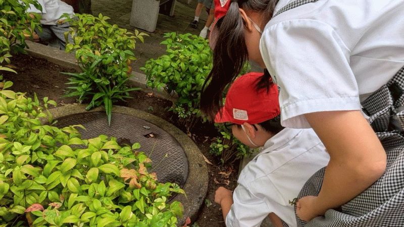 先生も一緒に、マンホールの近くや、土のあたりをきょろきょろ…