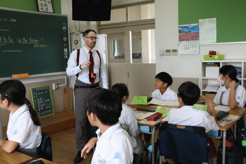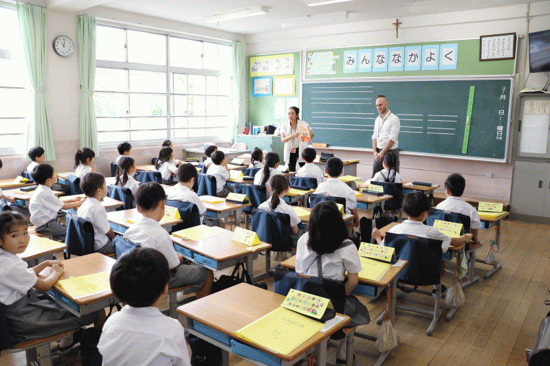 城星学園小学校の英語の授業は、一年生から六年生まで、ネイティヴの先生と、日本人の先生が二名体制で行われています。