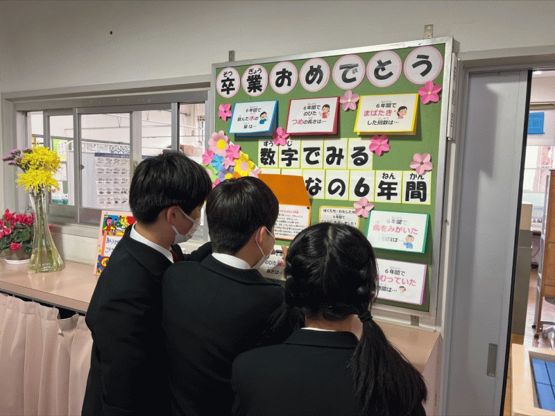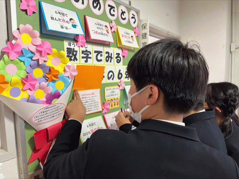月日が流れるのは早く,もう3月となりました。年度末を迎え,校内は6年生の卒業を祝福する掲示がされています。