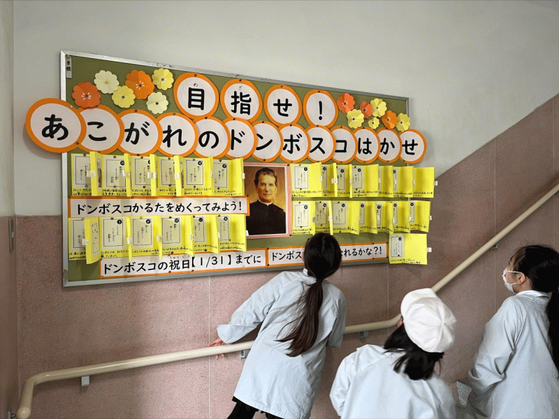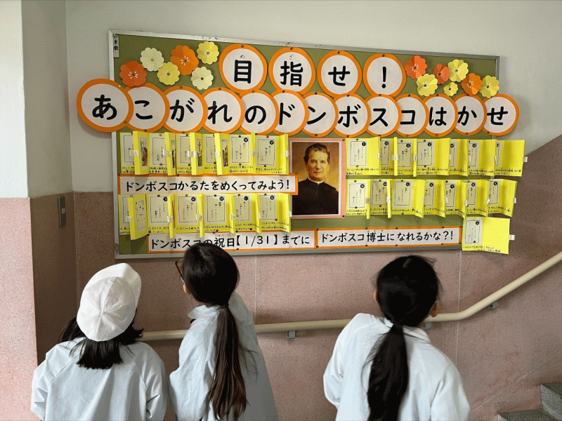 掲示板には,ドン・ボスコに関係する言葉をかるた形式で紹介しています。