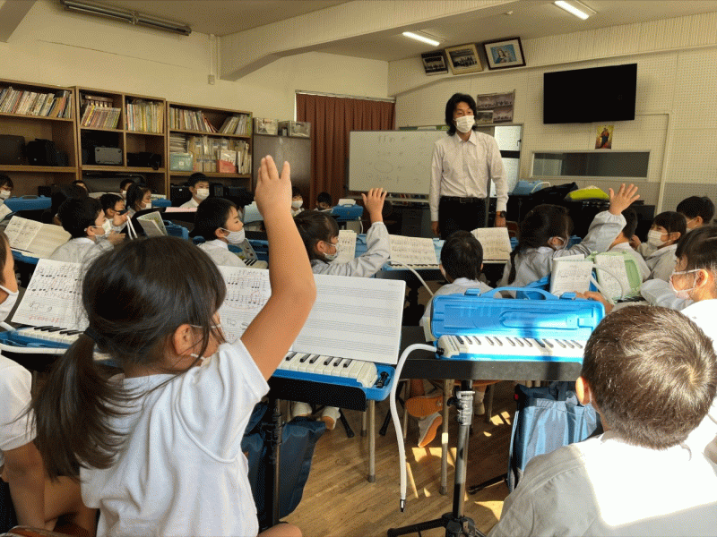 写真は1年生の授業風景です。楽しく学んでいます。写譜されたノートからも子どもたちの努力が伝わります。