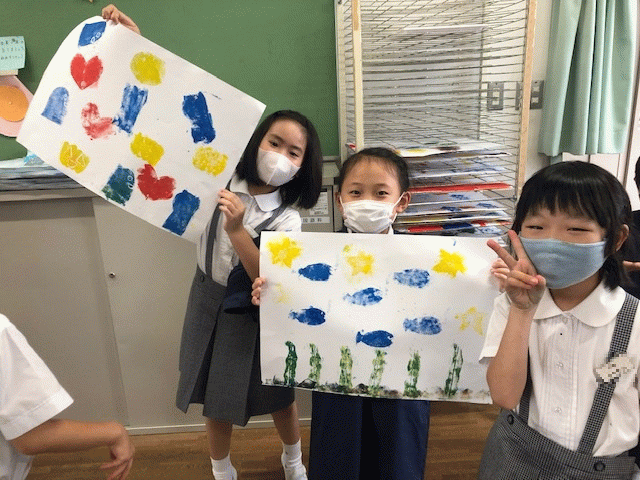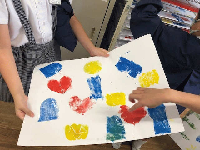 自分で作った版にインクをつけて、画用紙いっぱいに写しました。