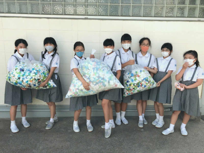 写真は宗教委員の児童がペットボトルキャップを集めている様子です。