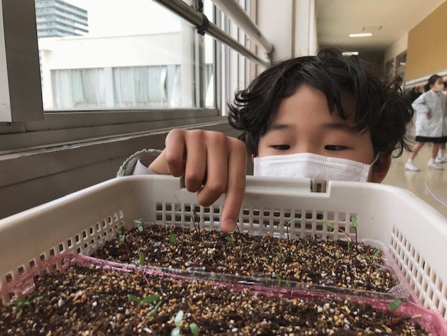 三年生が蒔いたマリーゴールドの種から芽が出てきました。
