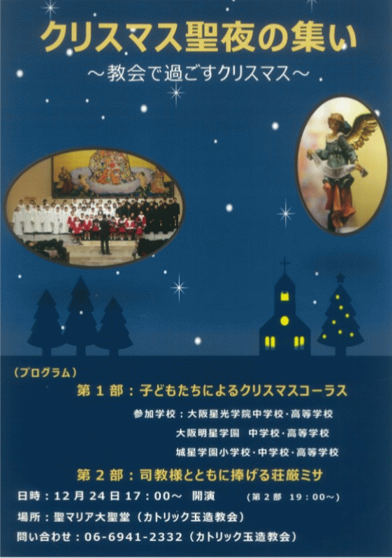 全 3004 件(全601ページ) 過去のページもご覧いただけます ⇒ 前へ 231 | 232 | 233 | 234 | 235 | 次へ 2019/12/18 よいお年を! 「字がとっても上手になったけど,練習したの?」 「字がとっても上手になったけど,練習したの?」 本日は2学期の終業式。自分の成長を振り返る日です。 本日は2学期の終業式。自分の成長を振り返る日です。 2学期はもっとも行事の多い時期です。一つ一つの目標に向かって,努力を重ねた子どもたち。 2学期はもっとも行事の多い時期です。一つ一つの目標に向かって,努力を重ねた子どもたち。 知らず知らずのうちに,心も体も成長しました。 知らず知らずのうちに,心も体も成長しました。 冬休み明け,3学期が始まります。3学期はまとめの時期。学年の締めくくりにどんな自分でありたいのか,お休みの間にぜひ考えてほしいです。 冬休み明け,3学期が始まります。3学期はまとめの時期。学年の締めくくりにどんな自分でありたいのか,お休みの間にぜひ考えてほしいです。 よいお年を! 2019/12/18 「字がとっても上手になったけど,練習したの?」 「字がとっても上手になったけど,練習したの?」 本日は2学期の終業式。自分の成長を振り返る日です。 本日は2学期の終業式。自分の成長を振り返る日です。 2学期はもっとも行事の多い時期です。一つ一つの目標に向かって,努力を重ねた子どもたち。 2学期はもっとも行事の多い時期です。一つ一つの目標に向かって,努力を重ねた子どもたち。 知らず知らずのうちに,心も体も成長しました。 知らず知らずのうちに,心も体も成長しました。 冬休み明け,3学期が始まります。3学期はまとめの時期。学年の締めくくりにどんな自分でありたいのか,お休みの間にぜひ考えてほしいです。 冬休み明け,3学期が始まります。3学期はまとめの時期。学年の締めくくりにどんな自分でありたいのか,お休みの間にぜひ考えてほしいです。 2019/12/17 一足早いクリスマス いよいよこの日を迎えることができました。役に当たっている子も,そうでない子も,クリスマスページェントのため練習に励んでいました。 いよいよこの日を迎えることができました。役に当たっている子も,そうでない子も,クリスマスページェントのため練習に励んでいました。 心をあわせ,みんなで作り上げたクリスマスページェント。 心をあわせ,みんなで作り上げたクリスマスページェント。 保護者の皆様や新1年生になる園児の皆さんをお迎えすることができました。当日お越しいただいた皆様,ありがとうございました。 保護者の皆様や新1年生になる園児の皆さんをお迎えすることができました。当日お越しいただいた皆様,ありがとうございました。 一足早いクリスマス 2019/12/17 いよいよこの日を迎えることができました。役に当たっている子も,そうでない子も,クリスマスページェントのため練習に励んでいました。 いよいよこの日を迎えることができました。役に当たっている子も,そうでない子も,クリスマスページェントのため練習に励んでいました。 心をあわせ,みんなで作り上げたクリスマスページェント。 心をあわせ,みんなで作り上げたクリスマスページェント。 保護者の皆様や新1年生になる園児の皆さんをお迎えすることができました。当日お越しいただいた皆様,ありがとうございました。 保護者の皆様や新1年生になる園児の皆さんをお迎えすることができました。当日お越しいただいた皆様,ありがとうございました。 2019/12/13 クリスマスチャリティー 本日は,全校で集めたクリスマスチャリティーを,「出会いの家」の方々が受け取りにこられました。 本日は,全校で集めたクリスマスチャリティーを,「出会いの家」の方々が受け取りにこられました。 皆さんから寄せられたお米やカップ麺は生活に困っている方にとって,とても助かる物資だそうです。 皆さんから寄せられたお米やカップ麺は生活に困っている方にとって,とても助かる物資だそうです。 釜ヶ崎の出会いの家の方々に,素敵なクリスマスが訪れますように・・・・・・。 釜ヶ崎の出会いの家の方々に,素敵なクリスマスが訪れますように・・・・・・。 クリスマスチャリティー 2019/12/13 本日は,全校で集めたクリスマスチャリティーを,「出会いの家」の方々が受け取りにこられました。 本日は,全校で集めたクリスマスチャリティーを,「出会いの家」の方々が受け取りにこられました。 皆さんから寄せられたお米やカップ麺は生活に困っている方にとって,とても助かる物資だそうです。 皆さんから寄せられたお米やカップ麺は生活に困っている方にとって,とても助かる物資だそうです。 釜ヶ崎の出会いの家の方々に,素敵なクリスマスが訪れますように・・・・・・。 釜ヶ崎の出会いの家の方々に,素敵なクリスマスが訪れますように・・・・・・。 2019/12/10 クリスマス聖夜の集いのご案内 聖マリア大聖堂で,クリスマスに聖夜の集いが行われます。第一部のクリスマスコーラスでは,星光学院中学校・高等学校,明星学園中学校・高等学校