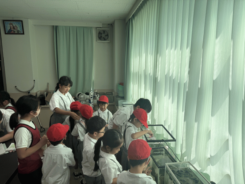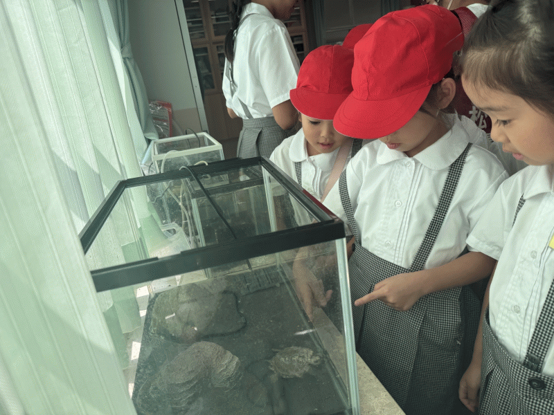 みんなで育てている、カメとコイのえさやりを体験しました。五年生、六年生の先輩がていねいに一年生にえさやりの方法を教え、一年生もとても楽しそうに活動していました。