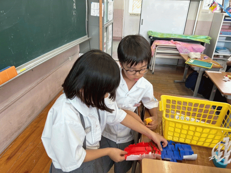二年生が一年生に七夕飾りの作り方を丁寧に教えました。