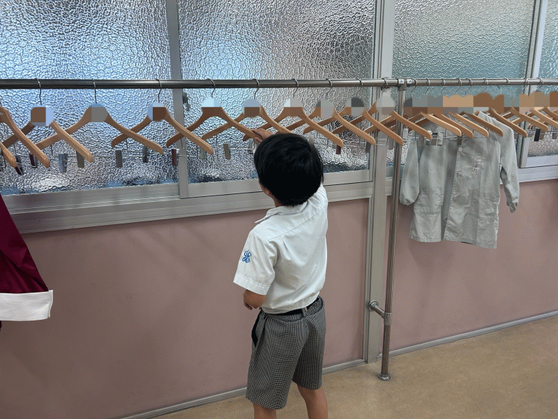 廊下のハンガーをひとつひとつ向きを揃えて均等に並べる児童がいました。