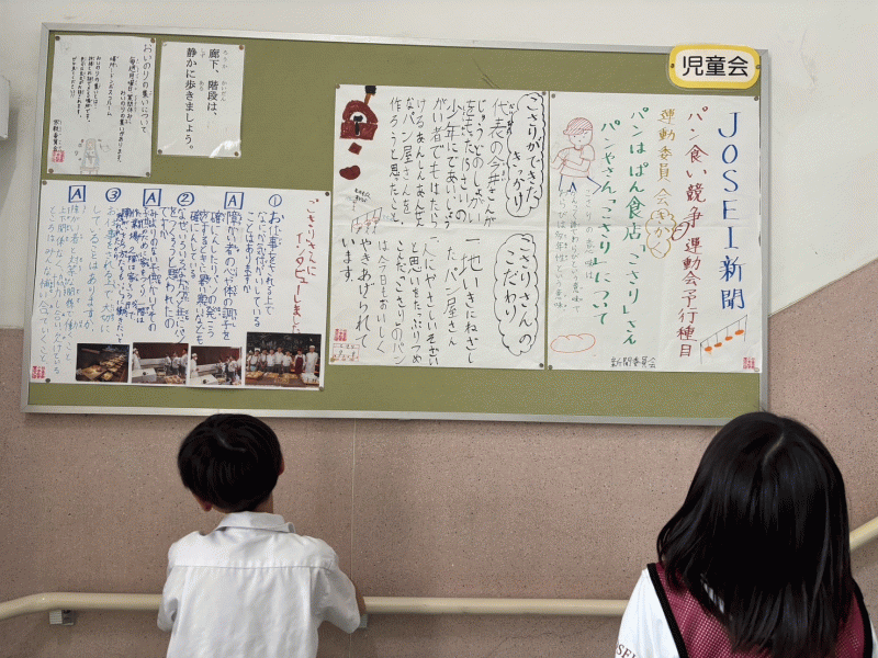 内容は、運動委員会が企画した運動会予行種目「パン食い競争」で使うパンのお店、ぱん食店「こさり」さんへのインタビュー記事です。