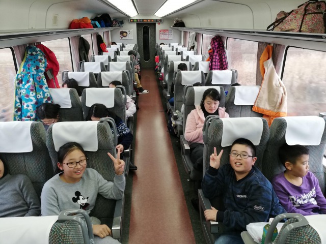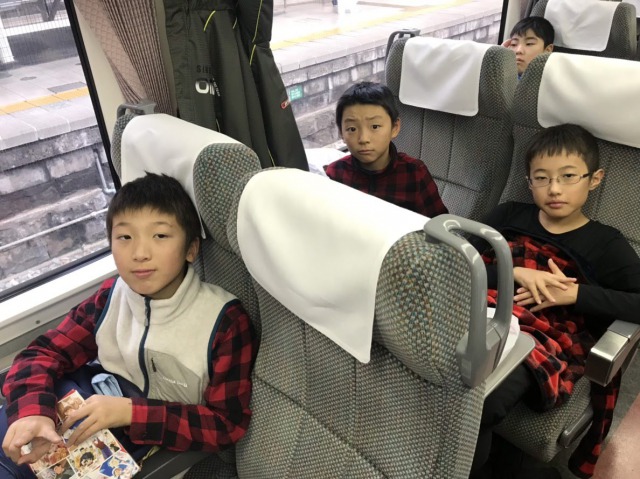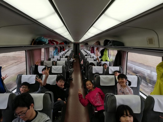 車中では,お喋り·勉強·仮眠とそれぞれに過ごしています。