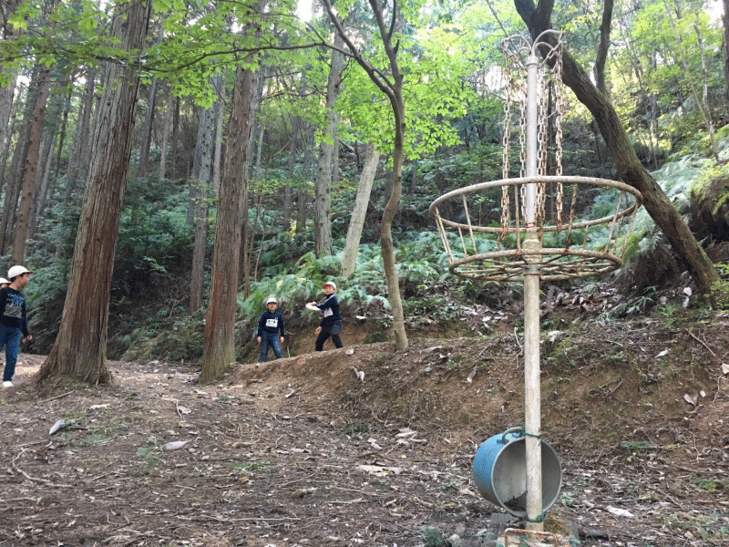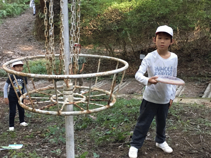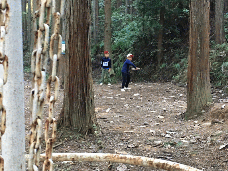 森の中で華麗にディスクゴルフです。自然の障害を避けつつ、ディスクをゴールへと投げていきます。上手に投げられたかな?
