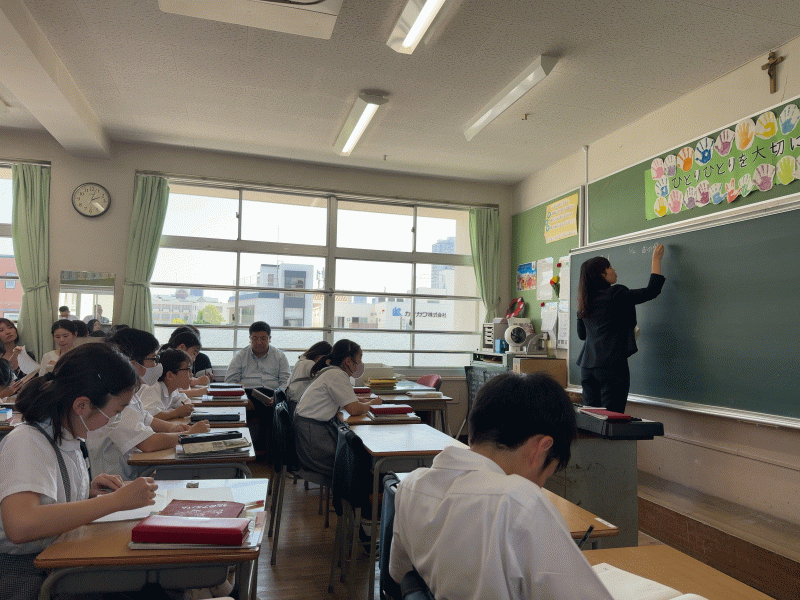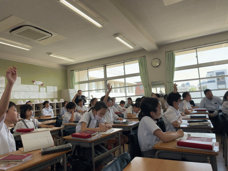 教室にたくさんの先生方がいらっしゃりクラスのみんなは少し緊張した様子でしたが、積極的に取り組む姿勢に、教員も深く学ぶことができました。