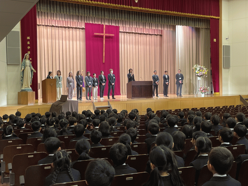 全 2994 件(全599ページ) 過去のページもご覧いただけます ⇒ 前へ 36 | 37 | 38 | 39 | 40 | 次へ 2025/4/9 新しい種をまく入学式 その2 新入生を迎えるための教室はとてもキラキラしています。6年生も早くお迎えしたい気持ちがいっぱいでとても楽しそうでした。1年生の手を引き、廊下を歩く姿や、桜のコサージュを付けてあげる姿は、6年生が、ぐんっと大人になっていて、ほほえましい気持ちになりました。 新しい種をまく入学式 その2 2025/4/9 新入生を迎えるための教室はとてもキラキラしています。6年生も早くお迎えしたい気持ちがいっぱいでとても楽しそうでした。1年生の手を引き、廊下を歩く姿や、桜のコサージュを付けてあげる姿は、6年生が、ぐんっと大人になっていて、ほほえましい気持ちになりました。 2025/4/9 新しい種をまく入学式 第73回入学式で114名の新入生を迎えました。 入学生のみなさんは どきどきした様子で入場しました。 入学生のみなさんは どきどきした様子で入場しました。 校長先生からは3つの大切なことを教えていただきました。 1.いつも喜んでいなさい 2.絶えず祈りなさい 3.どんなときも感謝しなさい 校長先生からは3つの大切なことを教えていただきました。 1.いつも喜んでいなさい 2.絶えず祈りなさい 3.どんなときも感謝しなさい 6年生から歓迎の言葉が送られ、 「わからないことがあったら、なんでも聞いてください!」と優しいメッセージを伝えてくれました。 6年生から歓迎の言葉が送られ、 「わからないことがあったら、なんでも聞いてください!」と優しいメッセージを伝えてくれました。 校庭の桜も今日という日を待ってくれていたかのように 満開を保っていてくれました。 校庭の桜も今日という日を待ってくれていたかのように 満開を保っていてくれました。 これから6年間楽しい時間をすごしましょうね♪ これから6年間楽しい時間をすごしましょうね♪ 新しい種をまく入学式 2025/4/9 第73回入学式で114名の新入生を迎えました。 入学生のみなさんは どきどきした様子で入場しました。 入学生のみなさんは どきどきした様子で入場しました。 校長先生からは3つの大切なことを教えていただきました。 1.いつも喜んでいなさい 2.絶えず祈りなさい 3.どんなときも感謝しなさい 校長先生からは3つの大切なことを教えていただきました。 1.いつも喜んでいなさい 2.絶えず祈りなさい 3.どんなときも感謝しなさい 6年生から歓迎の言葉が送られ、 「わからないことがあったら、なんでも聞いてください!」と優しいメッセージを伝えてくれました。 6年生から歓迎の言葉が送られ、 「わからないことがあったら、なんでも聞いてください!」と優しいメッセージを伝えてくれました。 校庭の桜も今日という日を待ってくれていたかのように 満開を保っていてくれました。 校庭の桜も今日という日を待ってくれていたかのように 満開を保っていてくれました。 これから6年間楽しい時間をすごしましょうね♪ これから6年間楽しい時間をすごしましょうね♪ 2025/4/8 心に花を咲かせる始業式 2025年前期の始業式でした校長先生から、聖歌「みんなで花園」の歌詞のようにみんなで作ろう城星を!と激励のお言葉をいただきました。今年は新しい先生を11人お迎えしました。新6年生は、いよいよ最終学年でみんな目と心を先生に向けて真剣にお話を聞いていました。それぞれのクラスのみなさんもしっかりと先生のお話を聞き、新たなスタートにわくわくです♪とある教室では、ドン・ボスコ先生の黒板アートがお出迎えしてくださいました。 心に花を咲かせる始業式 2025/4/8 2025年前期の始業式でした校長先生から、聖歌「みんなで花園」の歌詞のようにみんなで作ろう城星を!と激励のお言葉をいただきました。今年は新しい先生を11人お迎えしました。新6年生は、いよいよ最終学年でみんな目と心を先生に向けて真剣にお話を聞いていました。それぞれのクラスのみなさんもしっかりと先生のお話を聞き、新たなスタートにわくわくです♪とある教室では、ドン・ボスコ先生の黒板アートがお出迎えしてくださいました。 2025/3/28 恵みの日々に感謝 本校で44年間勤められた、奥校長先生が退職いたしました。 たくさんの子どもたちはもちろん、わたしたち教職員にとっても、多くの教えを頂いた師です。 たくさんの子どもたちはもちろん、わたしたち教職員にとっても、多くの教えを頂いた師です。 見送りに、学園の先生方が集まりました。 名残は尽きませんが、奥先生に頂いた教えを胸に、これからも城星学園へ集う子どもたちと愛に溢れる学園を築いていきます。 見送りに、学園の先生方が集まりました。 名残は尽きませんが、奥先生に頂いた教えを胸に、これからも城星学園へ集う子どもたちと愛に溢れる学園を築いていきます。 恵みの日々に感謝 2025/3/28 本校で44年間勤められた、奥校長先生が退職いたしました。 たくさんの子どもたちはもちろん、わたしたち教職員にとっても、多くの教え