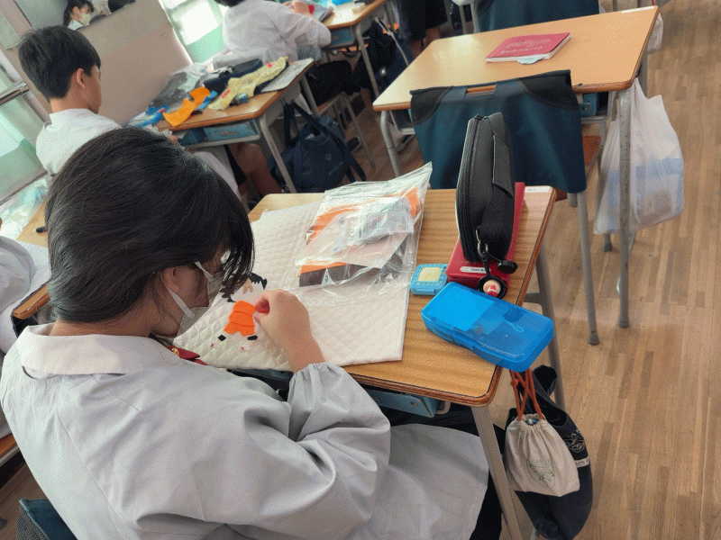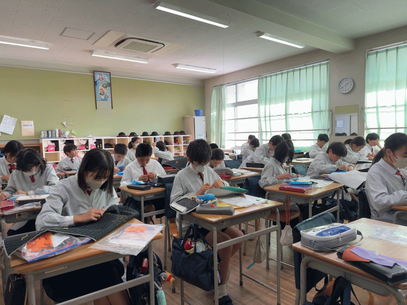 六年生の教室では、家庭科の授業中。みんなが集中して、心地よい静けさが漂っていました。