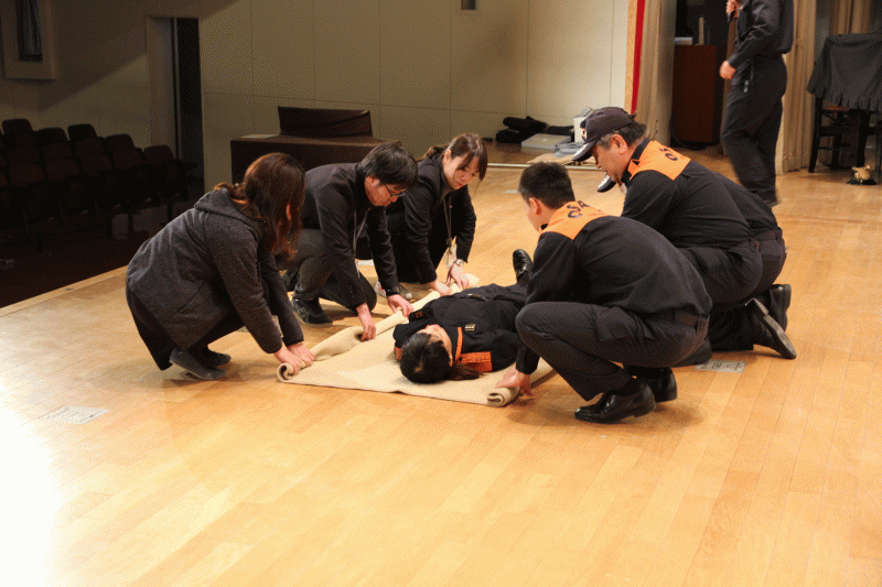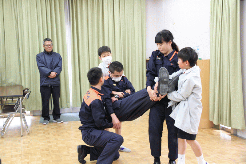 次に、災害時に怪我をした人の運搬の仕方を、教員も交えて子ども達に見せました。