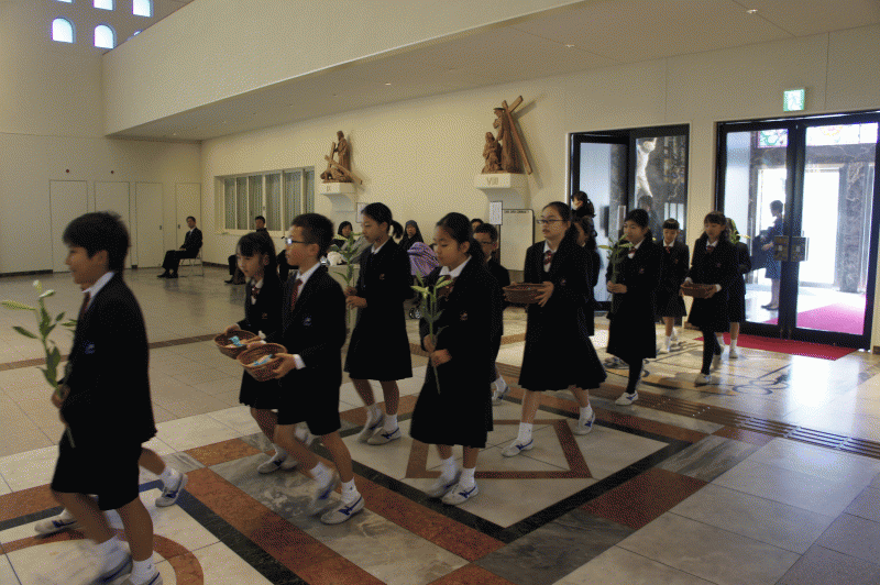 子どもたちは、9日間行った「徳の花」のカードとゆりの花を御捧げしました。