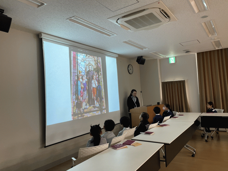 写真が変わるたびに「ドン・ボスコ!」「マンマ・マルゲリータ!」「ドミニコ・サヴィオ!」など、パッと大きな声で映っている人の名前を言えるのは、普段から宗教のお話をしっかり聞いている証です。