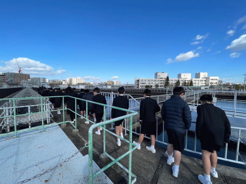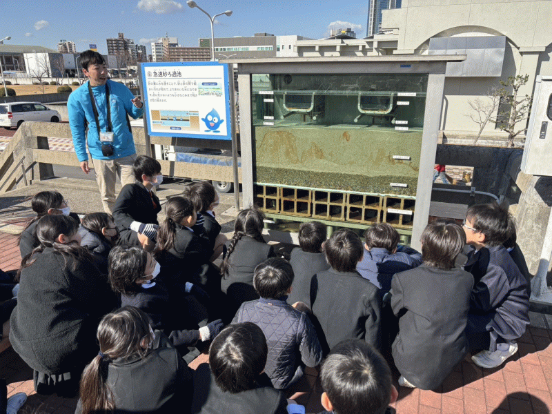 子どもたちは強い風にも負けず、水をきれいにする仕組みに興味津々!