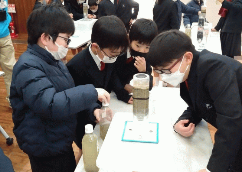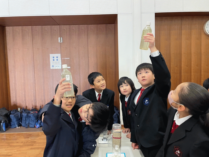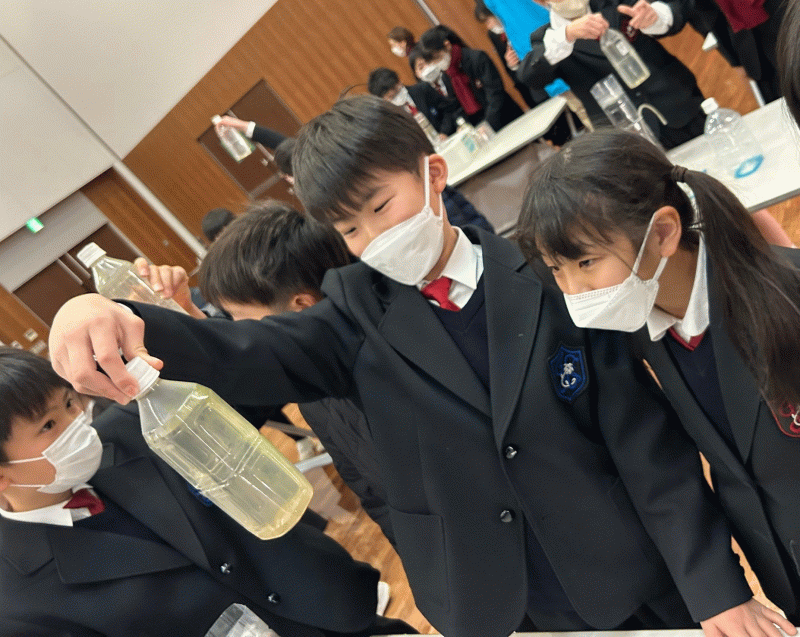 濁った水がろ過装置を通すことで、においが消えて透明になることを、実験からも学びました。