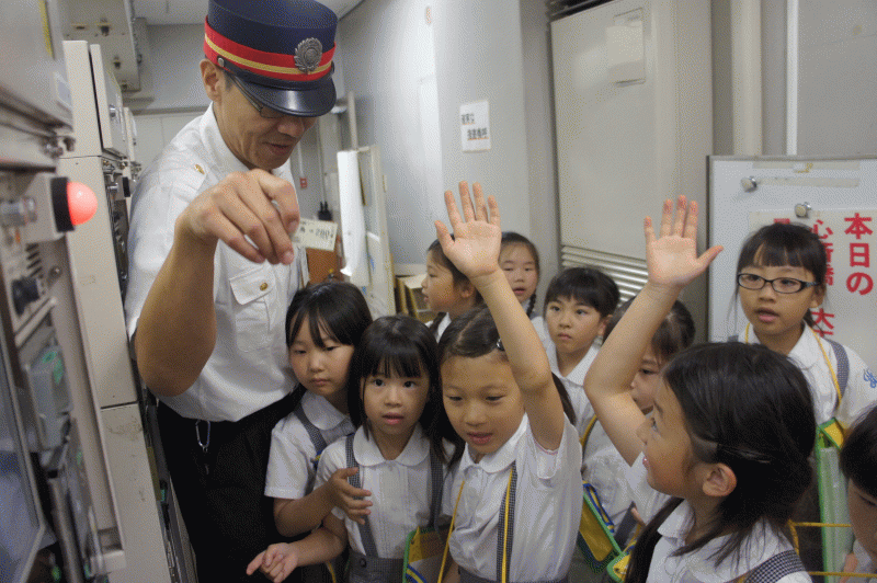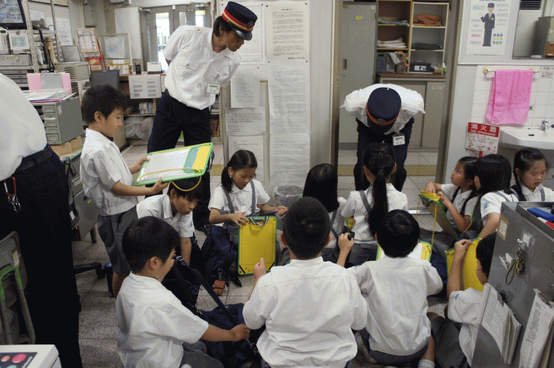 4つのグループに分かれて駅員さんから、駅や電車に関することを学びます