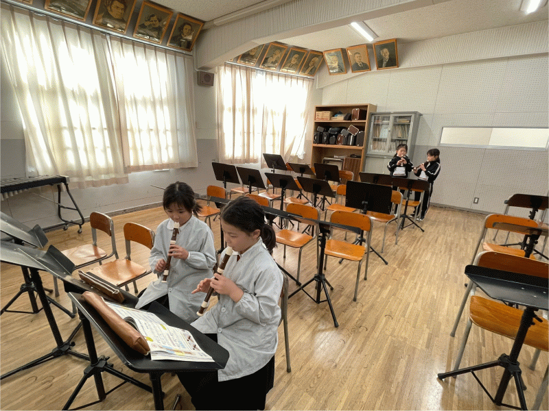 休み時間、音楽室でリコーダーを演奏している児童がいました。