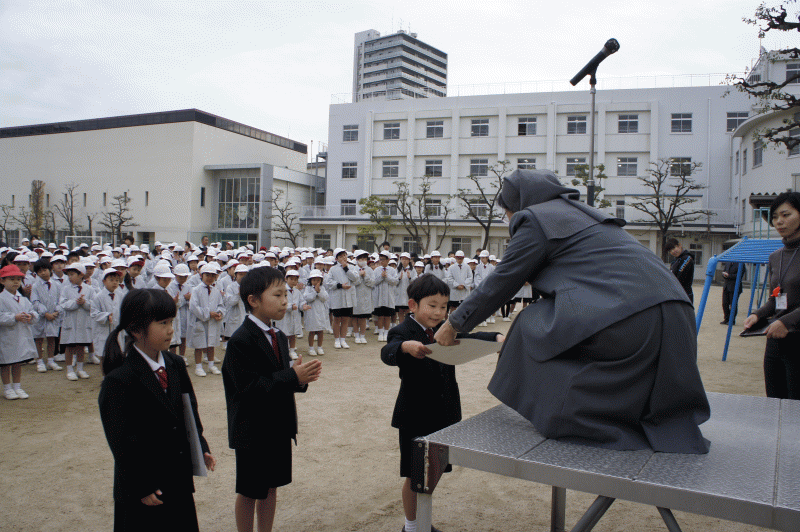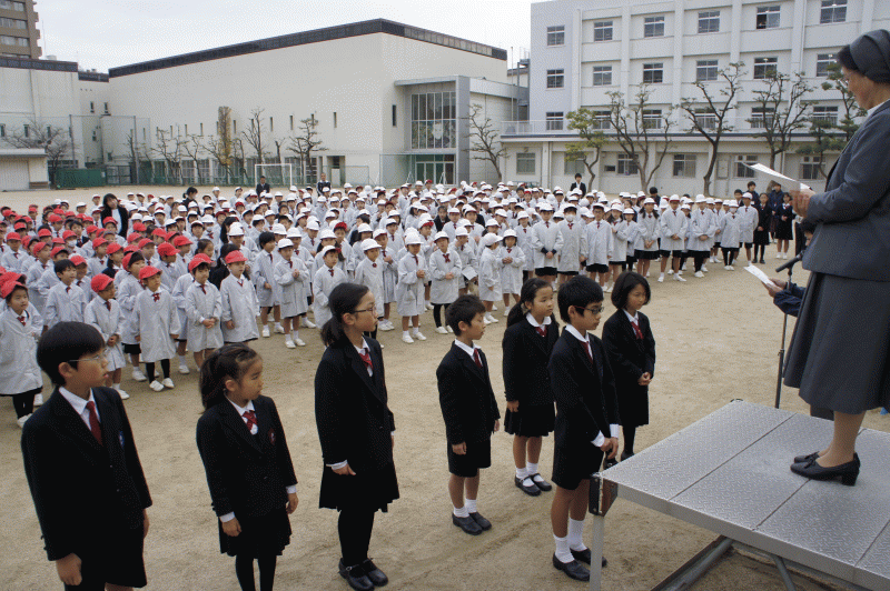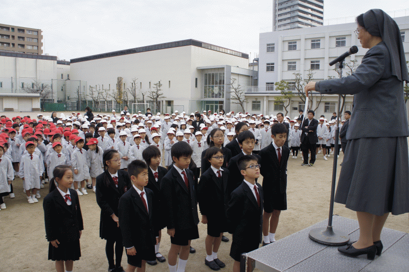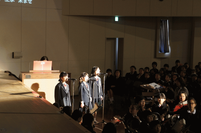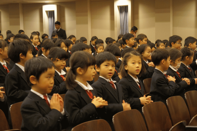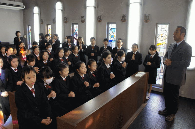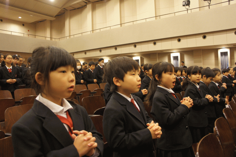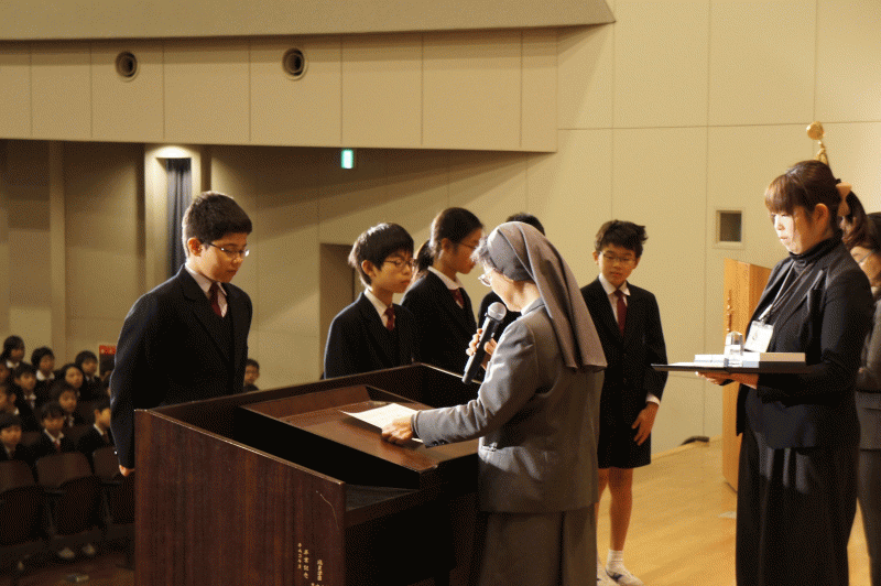お祈りと聖歌で始まる終業式。校長先生からは「感謝の一日にしましょう」とお話がありました。