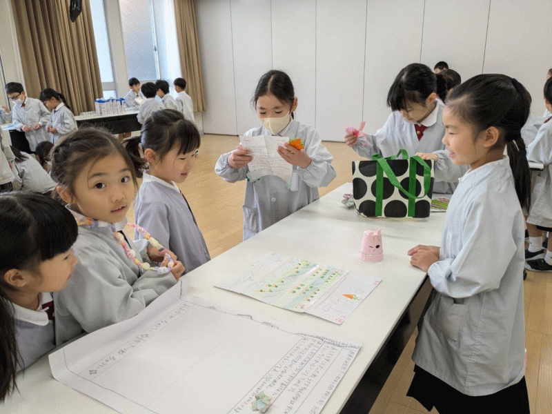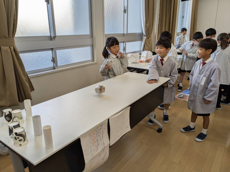 2年生は生活の授業で、身近にあるものに触れて素材の面白さに気付き、どんな遊びができるのか一生懸命考えておもちゃを作りました。作ったおもちゃを使って、「おもちゃランド」に1年生をご招待!
