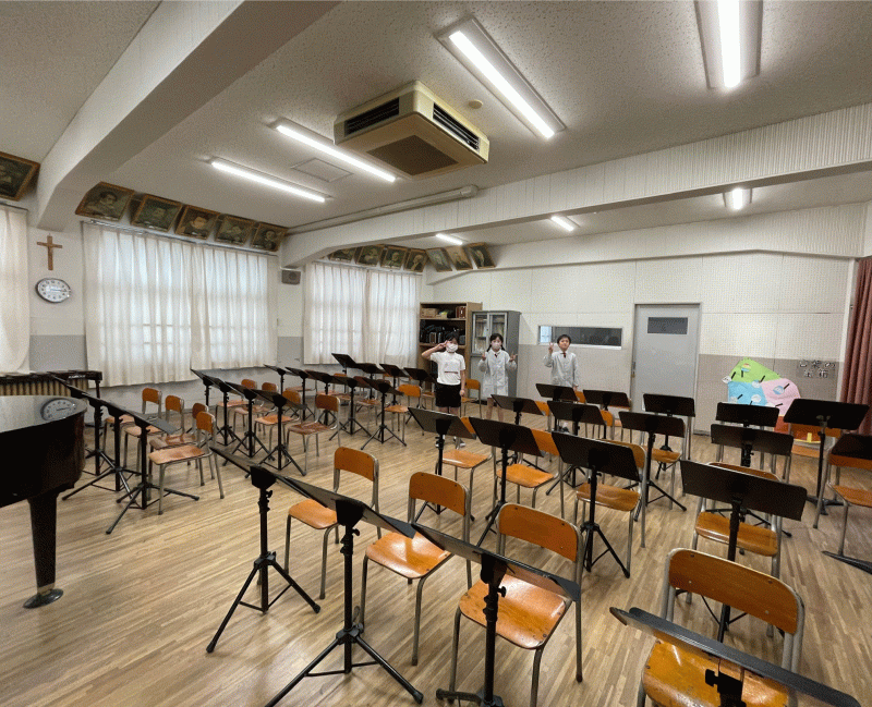 音楽室の譜面台と椅子を、縦・横きれいにそろえることができました。