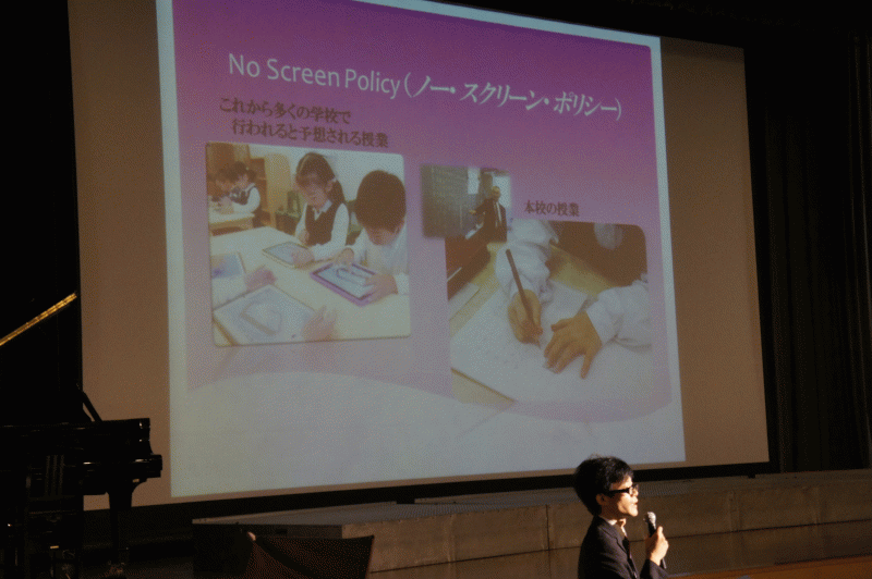 研究部長からは本校が力を入れている「書くこと」について、最近流行となっているデジタルに頼らない、本校の普遍的なアナログ教育についてのお話。