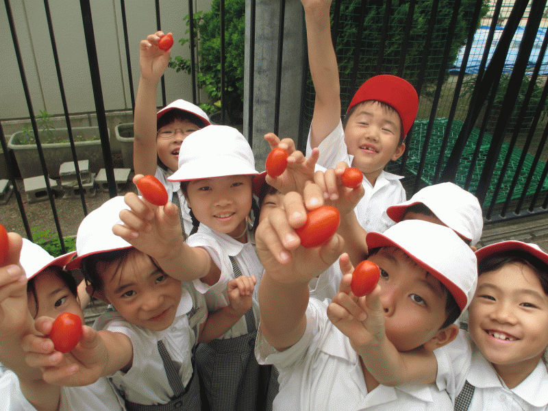 今日はもぎたてを口の中に!太陽と子ども達の愛で育ったトマト。口に入れたらみんな笑顔。
