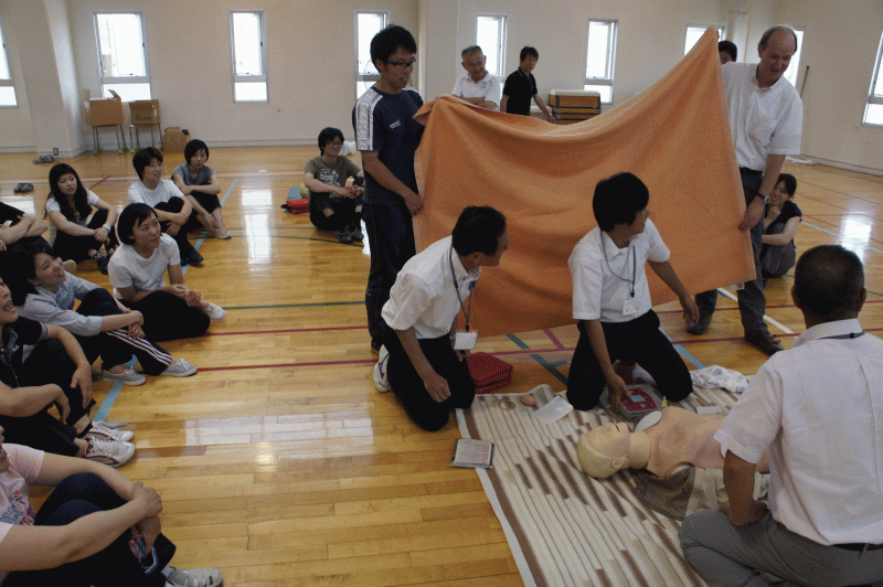 続いて、人形を使った人工呼吸、心マッサージ、そしてAEDのトレーニングです。