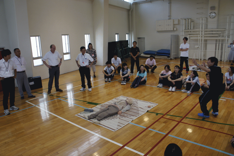 本日、体育館でサンタマリアスイミングスクールの高岸コーチを講師に迎え、「心肺蘇生法」の講習会を行いました。