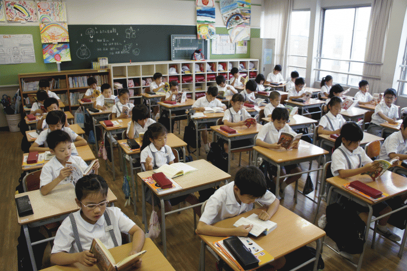教室に入ると子どもたちが読書をしています。本に関してはライトノベルや漫画でないものを薦めています。