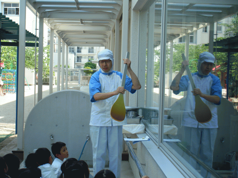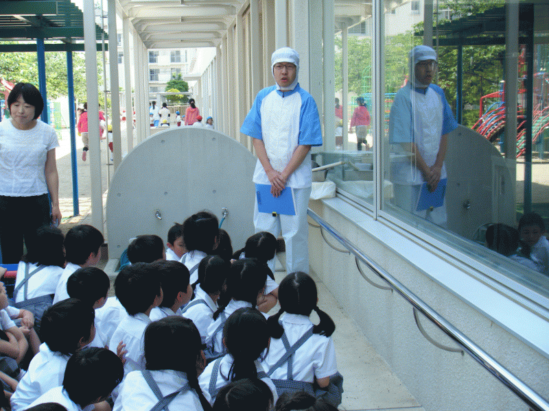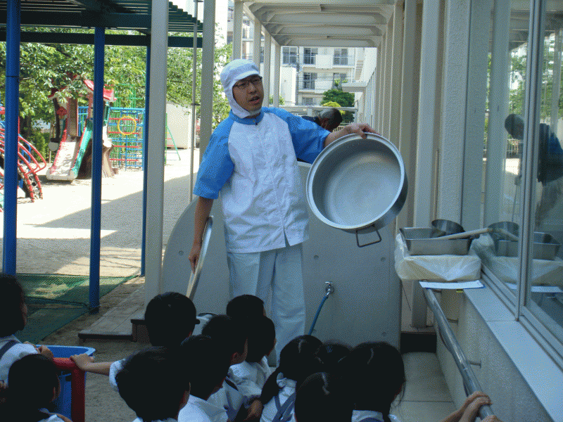 今日お話をしてくださったのは、学校でいつも給食を作ってくださる、調理師さん。