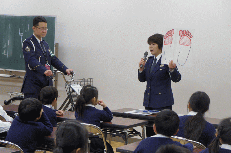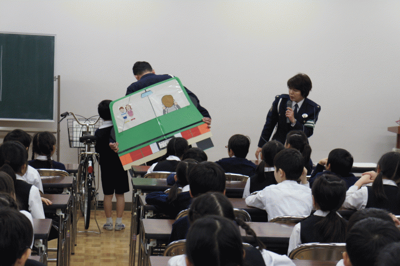 今日は3年生への「自転車安全教室」と1年生への「防犯ベル贈呈式」が行われました。