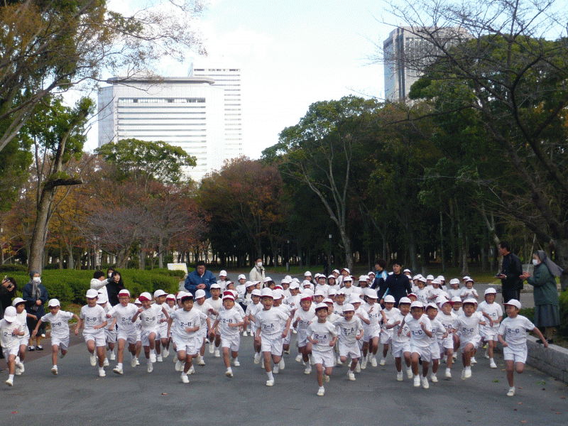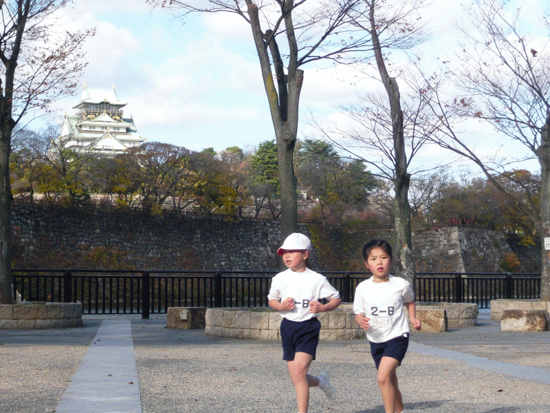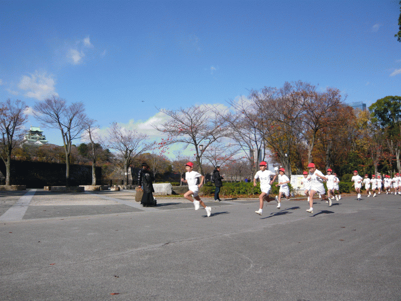子ども達は、マラソン大会の試走に大阪城公園に来ました。