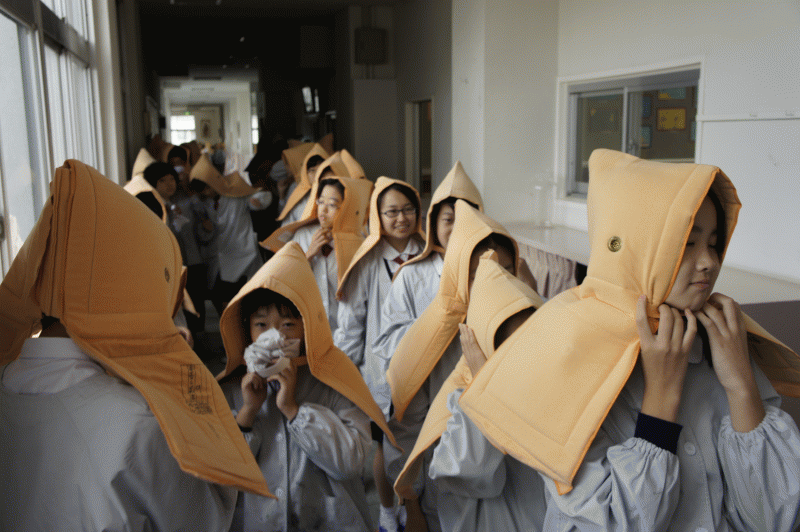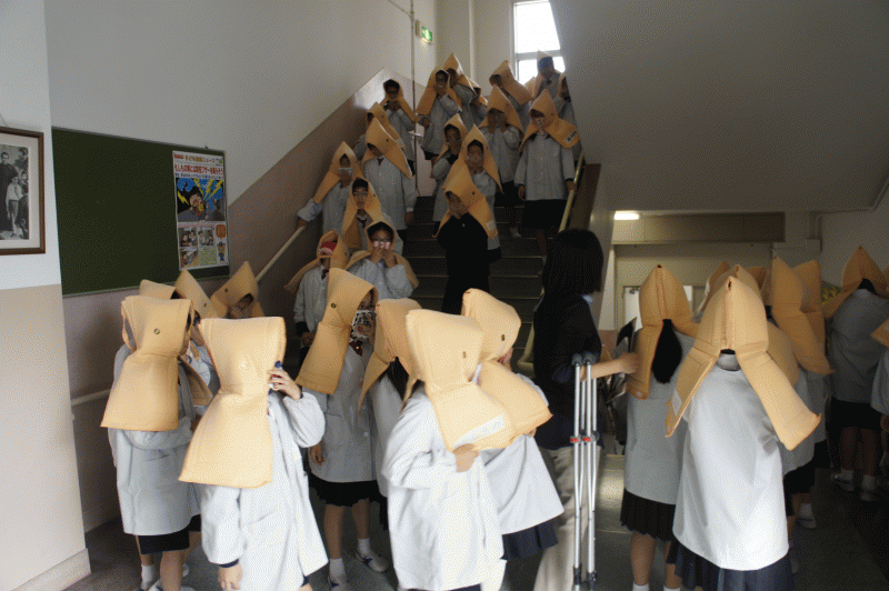 緊急地震速報の後、防災頭巾をかぶり机の中に隠れます。