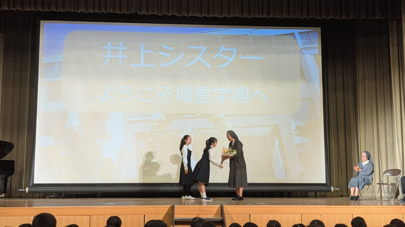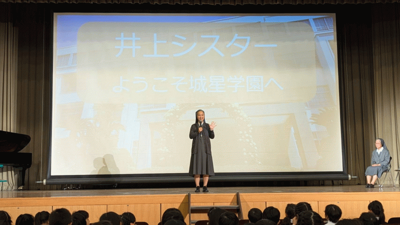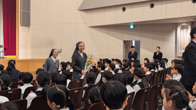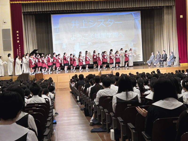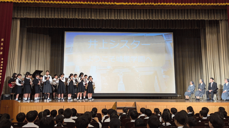 ウィンドアンサンブルと聖歌隊による歓迎演奏のあと、Sr井上より、教皇フランシスコの「指の祈り」をもとに、成長するにつれて大切にしてほしい5つのことを教えていただきました。