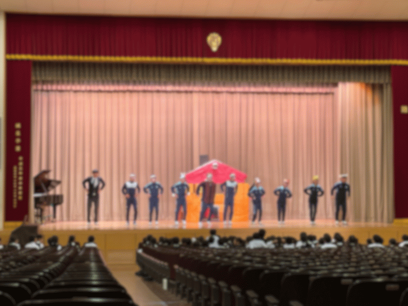 賢明学院高等学校の高校生によるリトミック劇「三匹の子ブタ」が上演され、1・2年生が鑑賞しました。