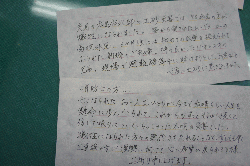 今回の献金は、この夏広島で起こった土砂災害で被害を受けた方々に送られます。