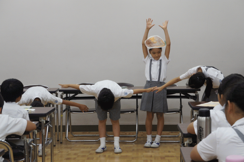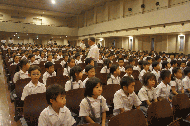 講堂に座る子どもたちの姿勢が違っていました。口を開かず背筋ピ〜ン!!