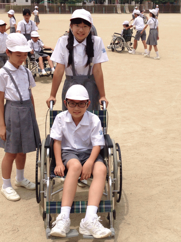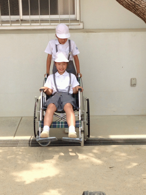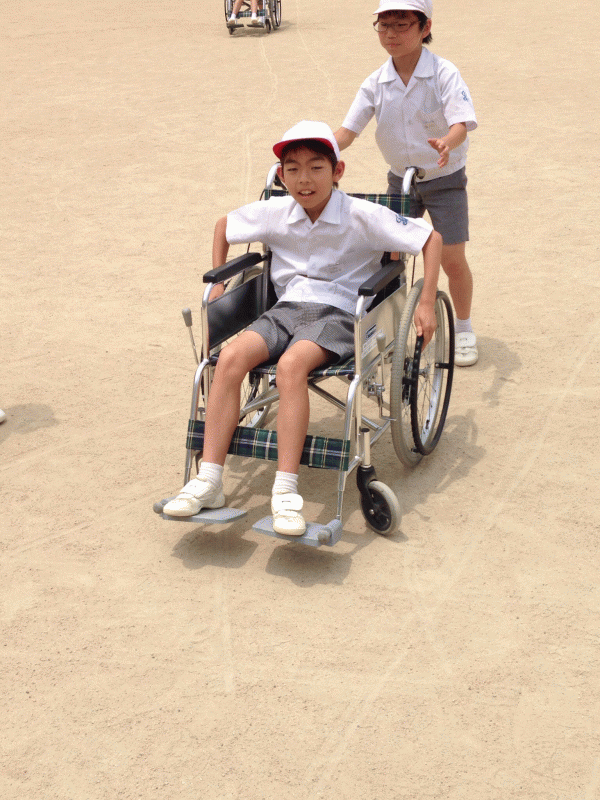 障がい者理解教育として高学年は車椅子を体験します。はじめてのった人も多かったですが、真剣に取り組めました。