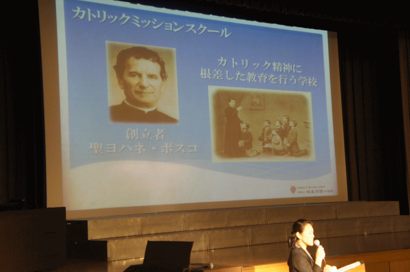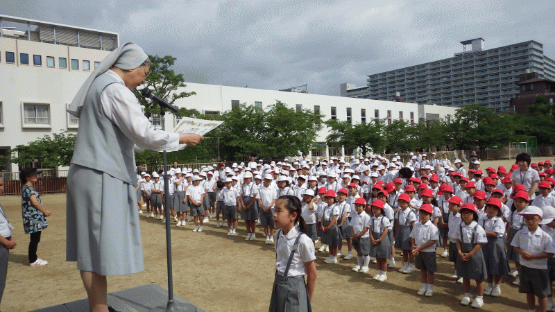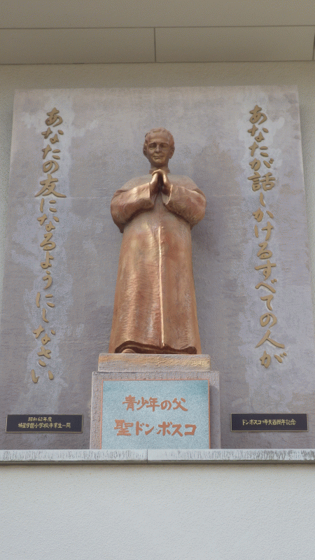 宗教朝会では校長先生が、運動場から見えるドン・ボスコのレリーフにある言葉