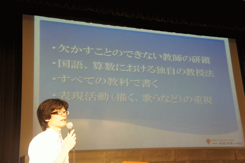 講堂で行われた説明会、まずは教務部長より「入試」に関する説明がありました。これまでの入試内容を例に「知能」「社会性」「運動」一つ一つ説明をしました。