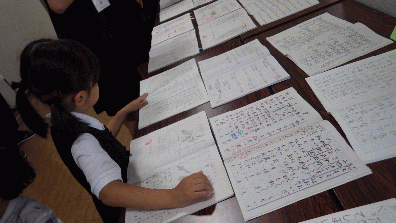 講堂入り口に置かれた子ども達のノートや作品をみていただく事で、説明では伝わらないことも実感していただけたのではないでしょうか。