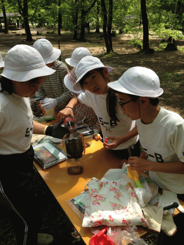 最終日,5年生はコーラを使って腐葉土の中性作用について学びました。